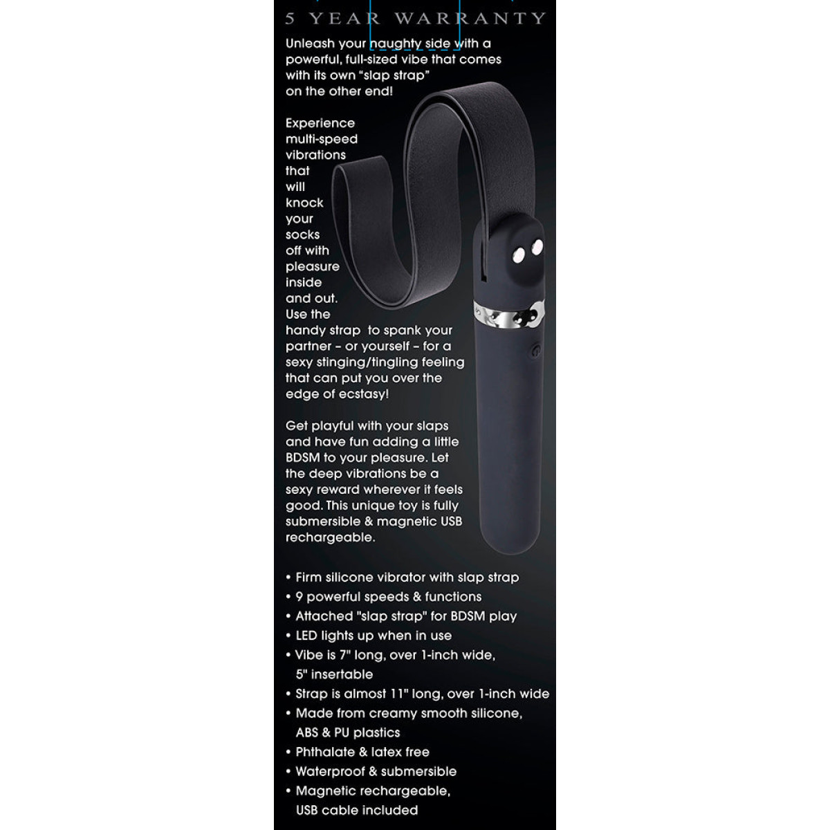 • 9 potentes velocidades y funciones de vibración • Luz led azul en el botón cuando está en uso • Batería recargable por medio de cable USB con Pin Magnético (Adaptador de corriente no incluido) • Tiempo de carga: 70 min • Tiempo d